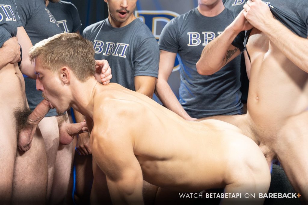 Hunter positioned himself on hands and knees in the center of the room, lifting his exposed asshole willingly inviting the first cock of the gang fuck. Brother Rocky knelt before the smooth pale, parted offering and pushed a gob of spit deep with his tongue, the only lube this brother received. The hole gave no resistance as Rocky’s forearm thick uncut cock sank entirely to the root and began its intrusion, inching closer towards his stomach with each thrust. Patiently waiting for his turn inside the bro-cunt, Brother Adam stopped Hunter’s moaning by pushing his prick into his throat. Brothers Rocky and Adam spit-roasted the vessel pleasing their manhoods. They both fuck deeper, trying to get their cock heads to touch in the middle of the initiate while the other brothers stroke themselves and encouraged the bottom whore to take more, more, more. Rocky slammed his large snake in and delivered the first load of the night. Brother Adam pulled out of Hunter’s throat and easily bottomed out in his ass. Long-dicking the glazed pucker, Adam churned Rocky’s deposit into a white froth, splattering the surrounding brothers with flying ass-frosting as he slammed inside, breeding him with load number two.